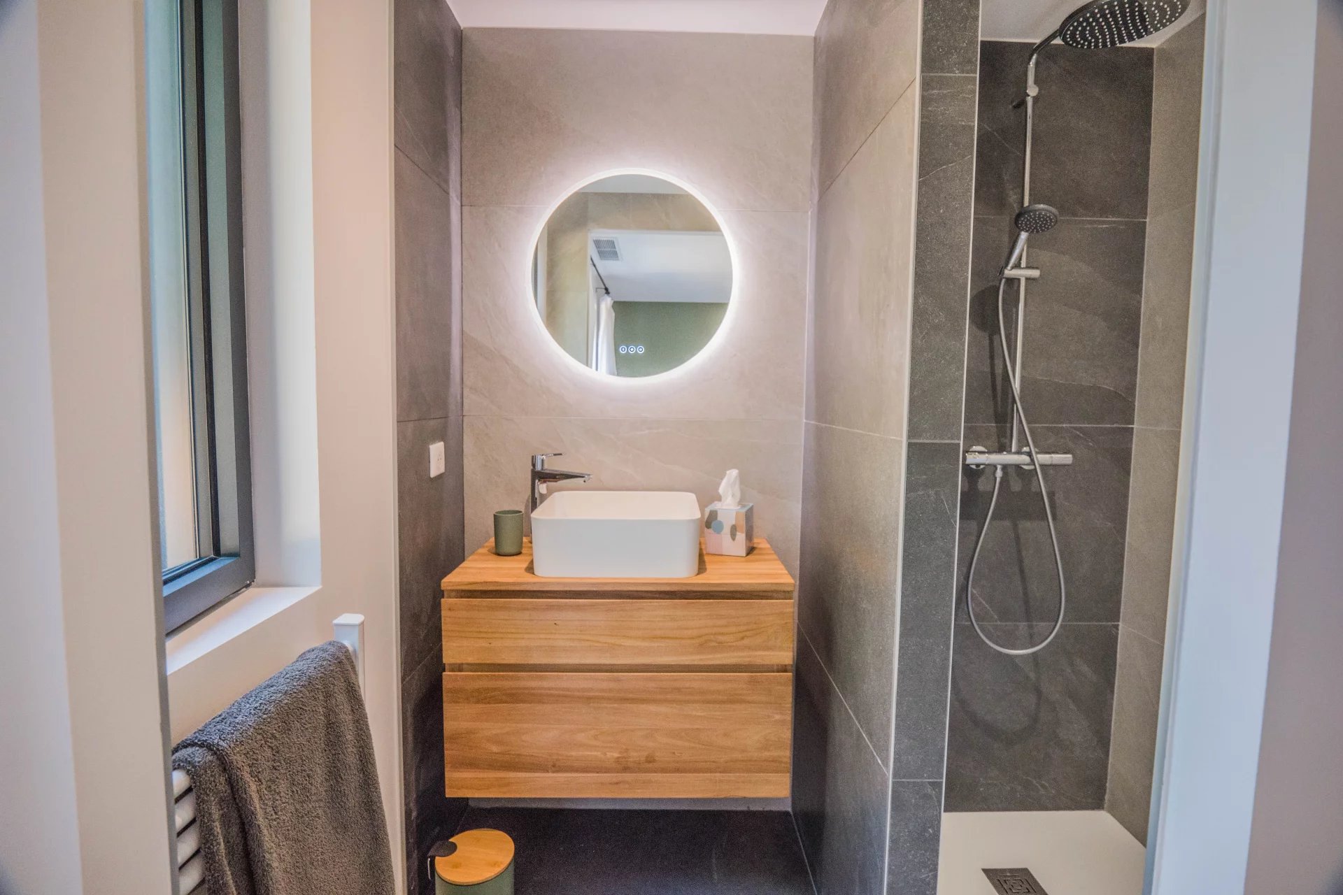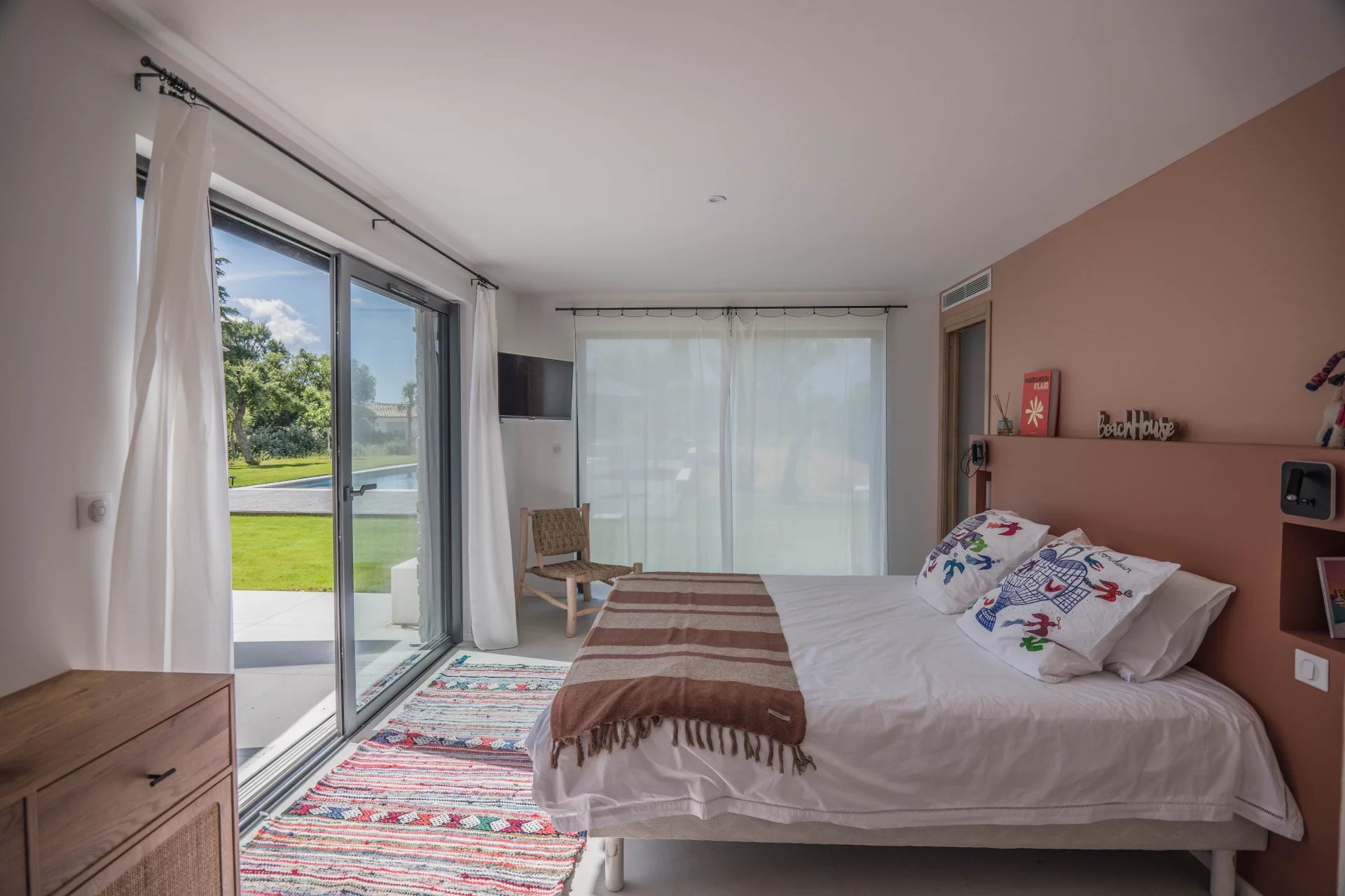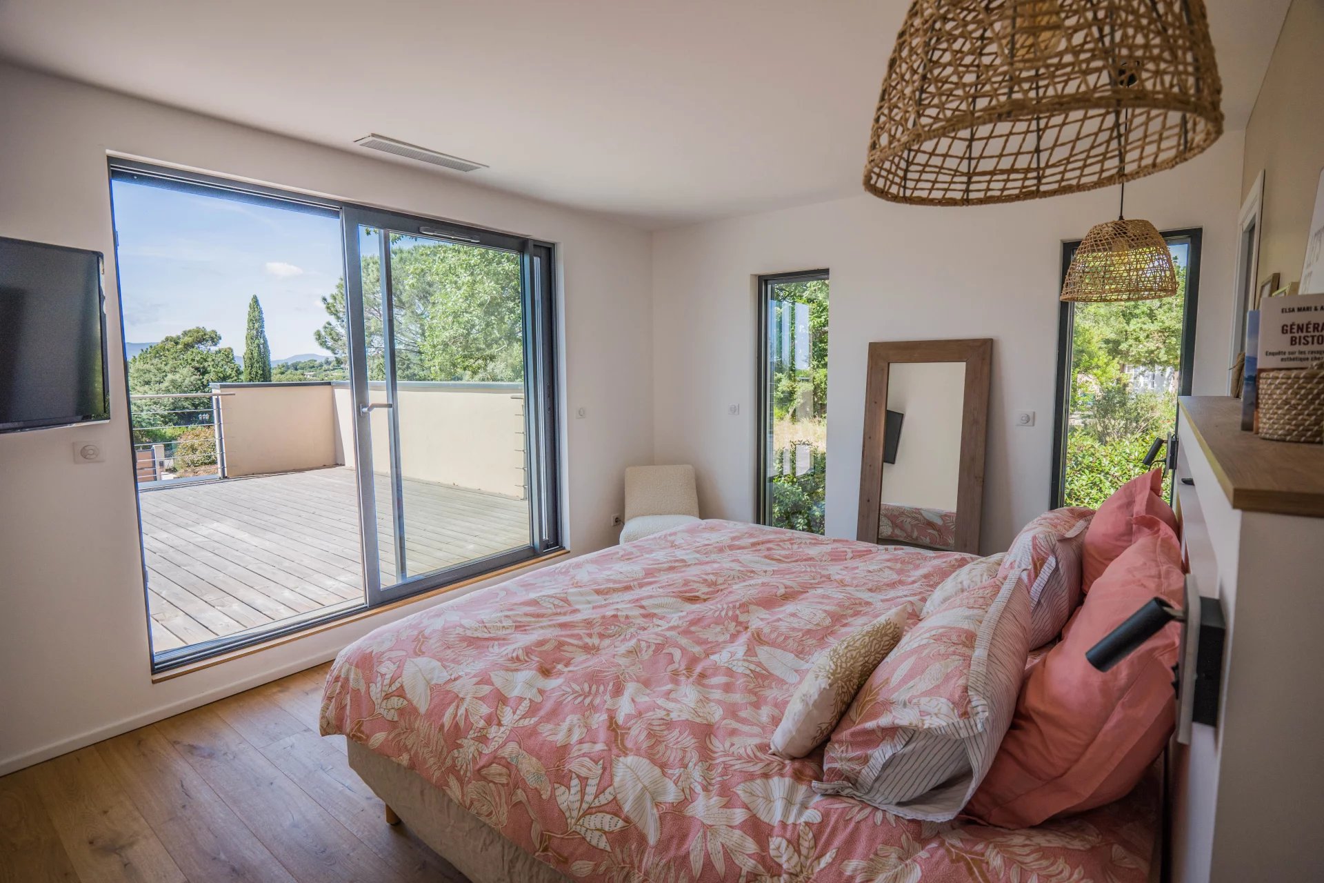 The entire first floor is reserved for the parental space: the bedroom, a full bathroom, a large dressing room, an office area and the terrace offering a lovely view of the hills and the boat masts.