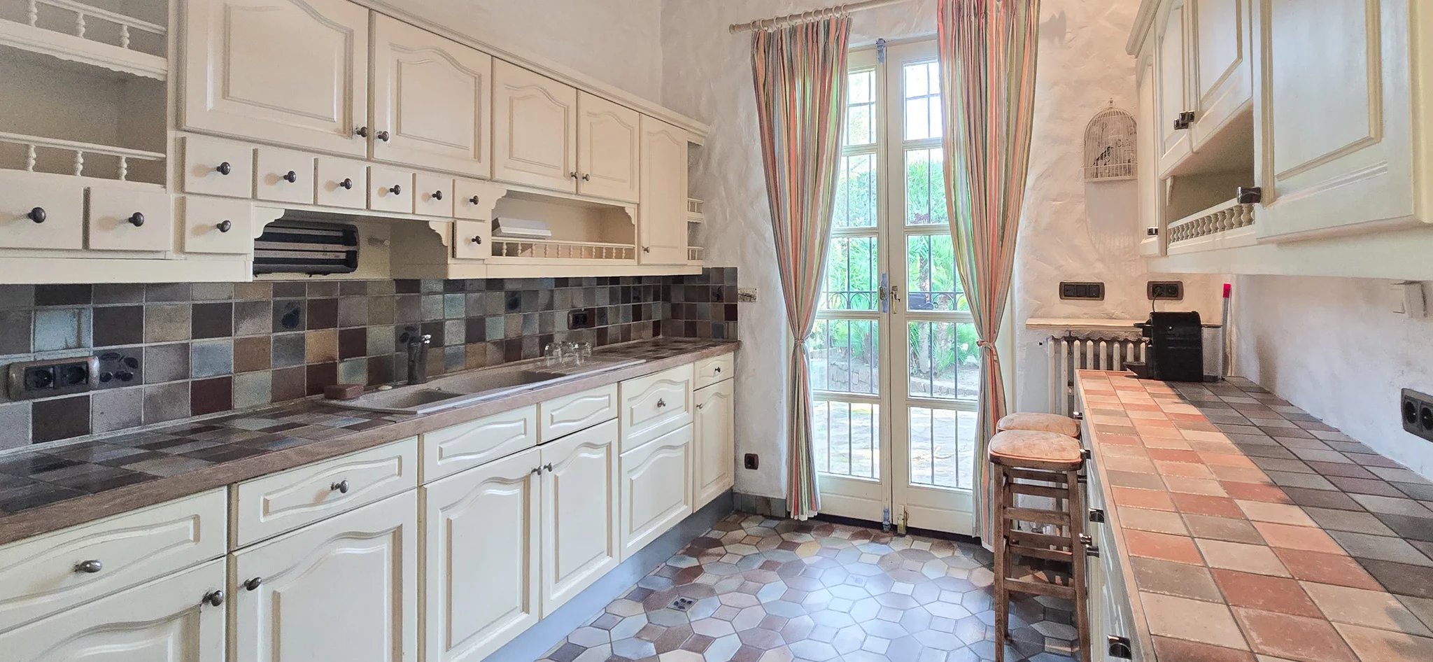 The main villa, facing southwest, is organized around a bright, triple reception room, enhanced by a double-sided fireplace and large windows opening onto the exterior, offering unobstructed views of the Maures mountains to the west and the Estérel massif to the east. A separate kitchen completes this welcoming and elegant living space.