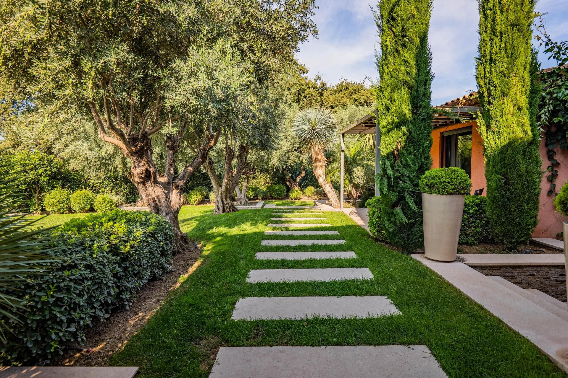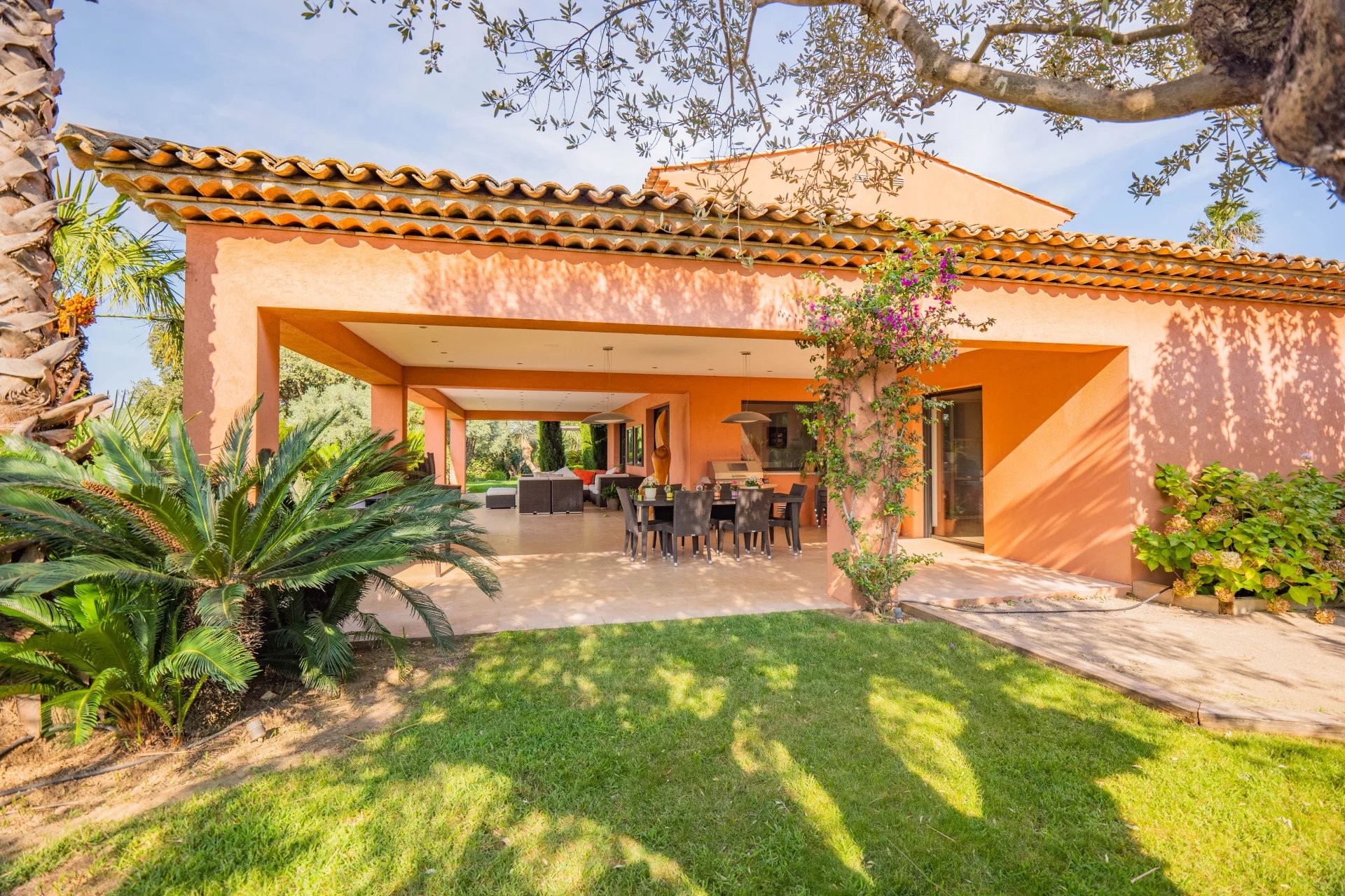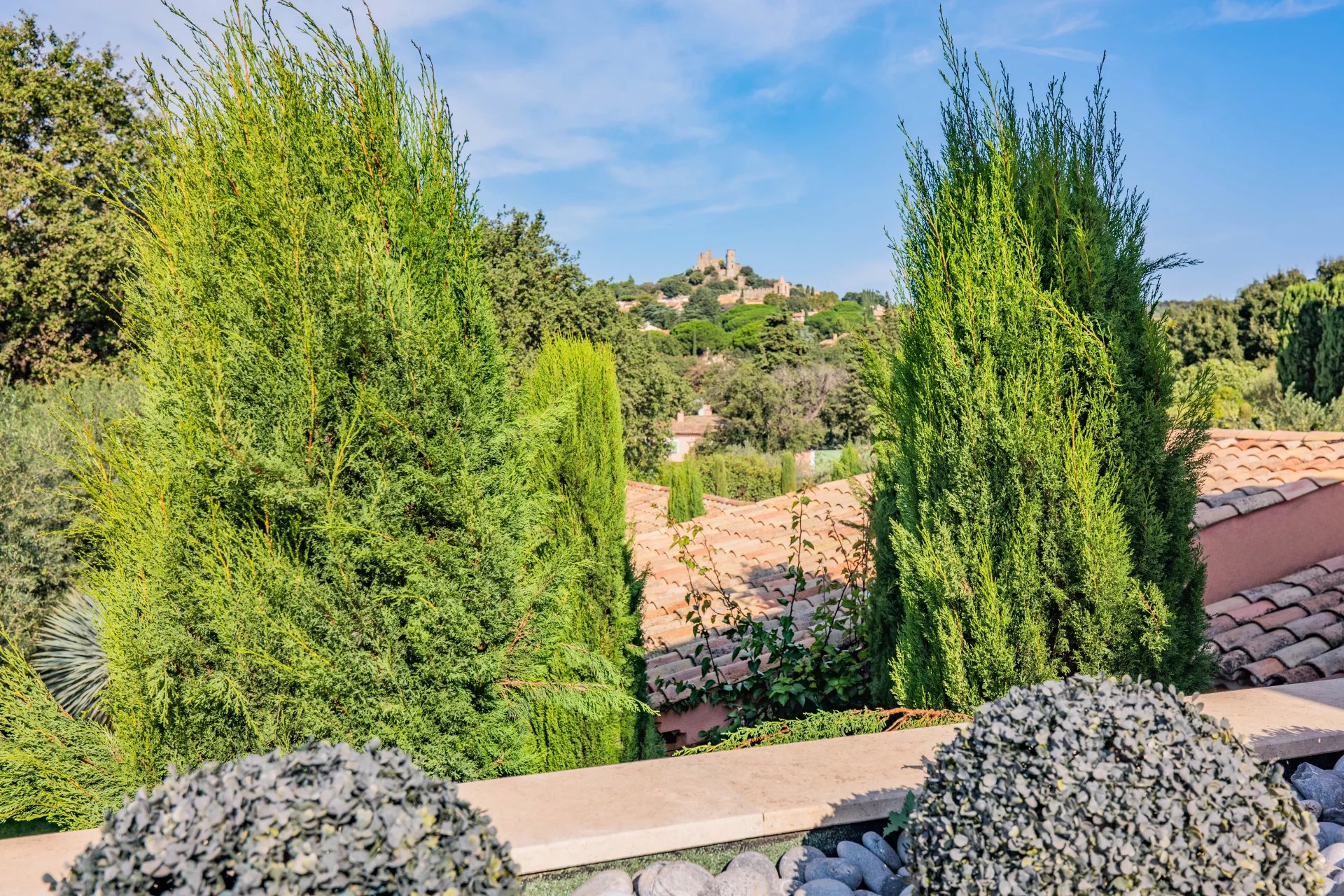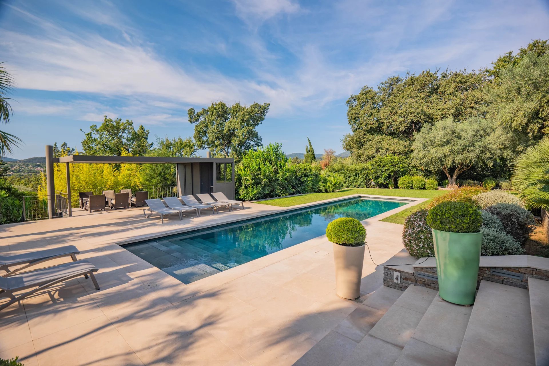 Découvrez cette villa exceptionnelle de 360 m², nichée sur un terrain de 3000 m² à deux pas du village de Grimaud. Profitez d'un magnifique jardin paysagé avec une piscine de 16 x 4 mètres, et admirez les vues splendides sur les collines et le château.