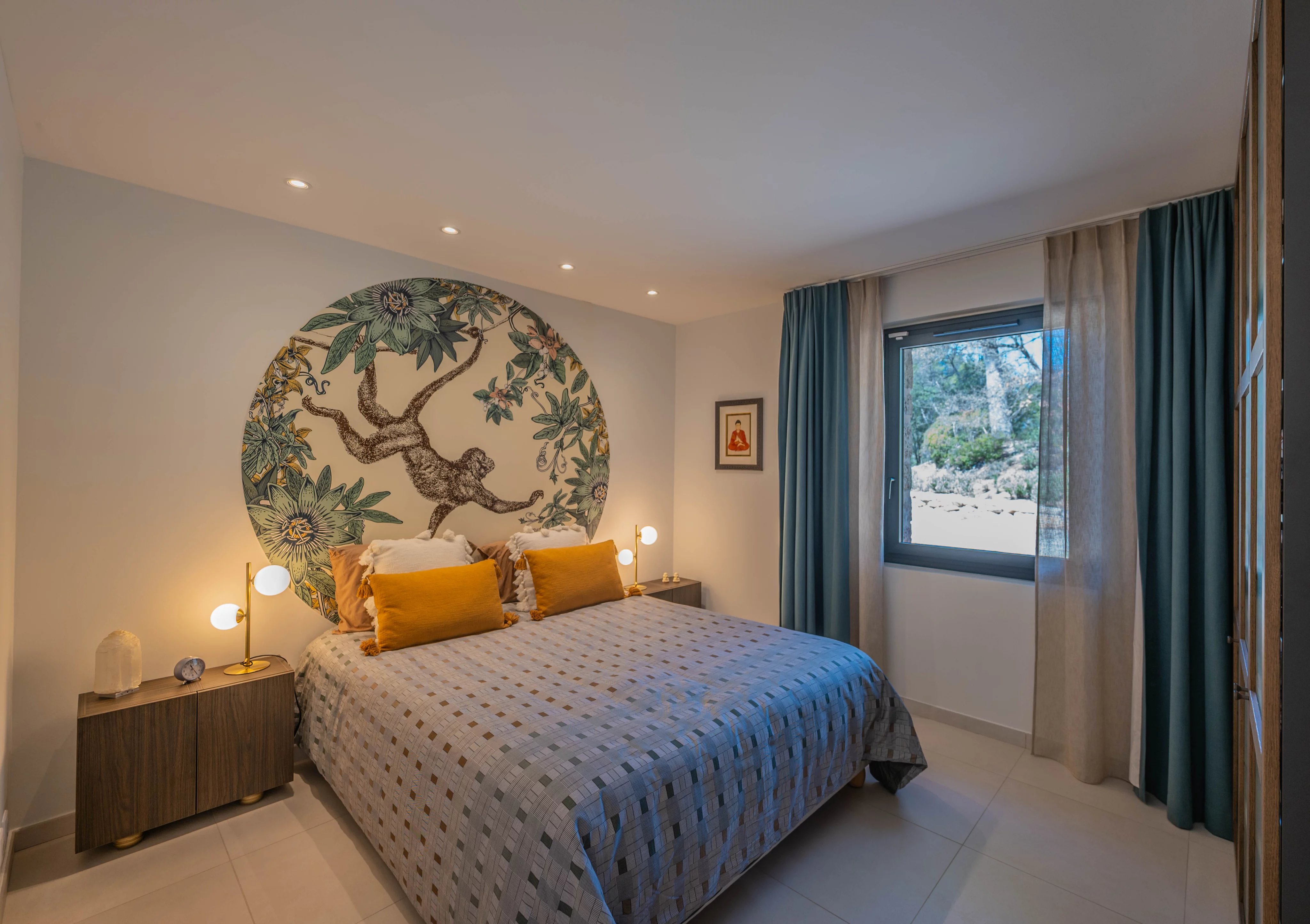 À l’extérieur, le jardin paysager, ponctué d’oliviers majestueux, entoure une piscine au sel de 11 x 6 mètres, parfaitement intégrée dans un environnement naturel préservé.